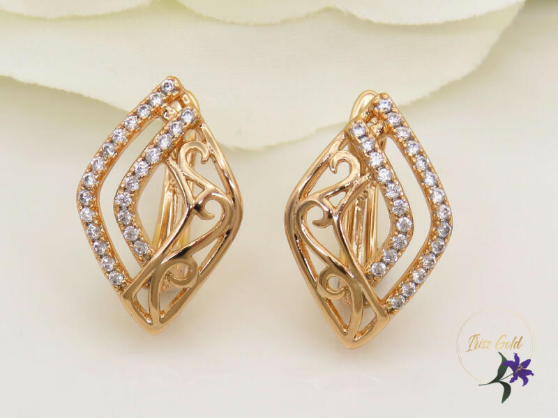 Gyönyörű arany fülbevaló egyedi dizájnnal, ahol a nemesfém kerek csomókba fonódik össze, középen átlátszó cirkon szikrájával kiegészítve. A fülbevaló felülete erősen fényes. A női patentos rögzítés kényelmes viseletet biztosít.