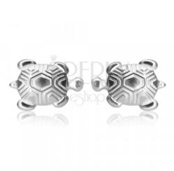 A 925 ezüst fülbevaló teknős alakú. A páncélja domború és szögletes vonalak díszítik. A közepén egy szembeötlő hatszög található. A fej, a lábak és a farok felülete fényes és sima. A fülbevaló hátulja üreges. Stekkeres zárszerkezettel rendelkezik. A fülbevaló mérete: 12 x 8 mmA fülbevaló súlya: 0,8 g Fémjelzéssel ellátva. Az ár egy párra vonatkozik.