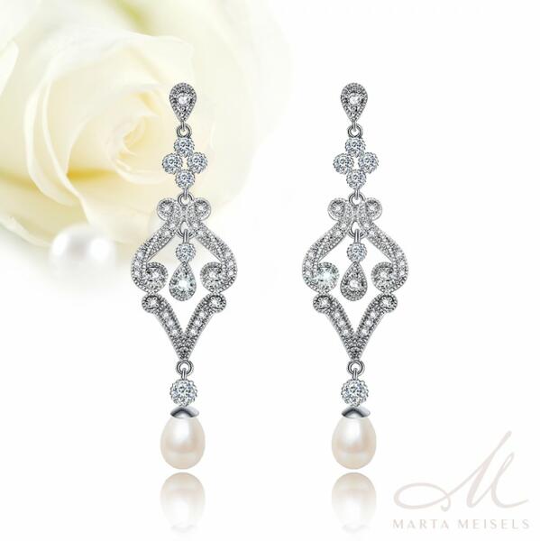 Gyönyörű szép kidolgozású, filigrán lógós menyasszonyi fülbevaló cirkónia kristályokkal és egy csepp alakú gyönggyel díszítve. Bőrbarát fémötvözetből készült, nem okoz allergiát. Valódi fehérarany bevonattal. Fülbevaló mérete: 5,3 cm x 1,3 cm Filigrán, vintage stílusú menyaszony fülbevaló, mely tökéletesen kiegészítheti a hófehér vagy a törtfehér menyas