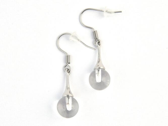 A hegyikristály 8 mm-es gömbjeiből, ródiummal bevont kehelyből és rozsdamentes acél akasztóból készített fülbevaló. A végén gumiharang található. A magassága kb. 3,2 cm.