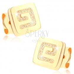 Bedugós fülbevaló sárga 9K aranyból, fényes négyzet alakban, enyhén kerekített sarkokkal, melynek a felületén egy szemcsés görög kulcs ábrázolódik ki. A fülbevaló hátlapja fényes és sima. Biztonságos viselését a stekker biztosítja. A fülbevaló méretei: 5 x 5 mmA fülbevaló súlya: 0,4 gFémjelzéssel ellátott. Az ár egy párra vonatkozik.
