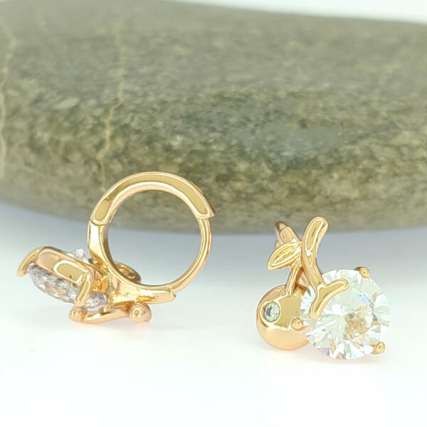 Aranyszínű karika fülbevaló, melyet fehér cirkónia kristályok tesznek csillogóvá és cseresznye motívum díszít. A kristályok karmos foglalatban helyezkednek el. Időtálló darab, nem kopik, nem feketedik, nem színezi a bőrt. Antiallergén ékszer, nem okoz panaszokat fémérzékeny hölgyeknek sem. 18K arany színben kapható. Cseresznye minta szélessége: 10,5 mm. Karika belső
