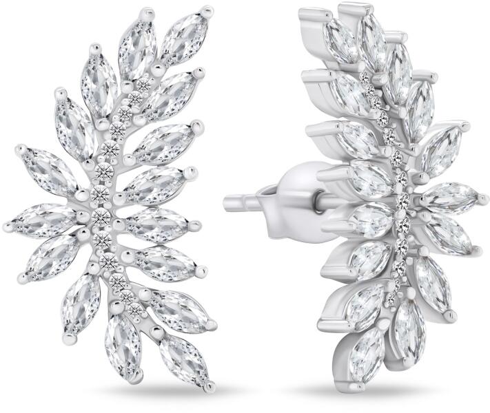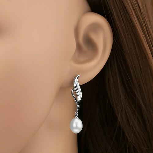 925 ezüst fülbevaló, három hullámos sávból áll, amelyek szabálytalan levél körvonalat alkotnak. A levél közepén egy függőleges sáv húzódik átlátszó cirkóniákkal kirakva. Az alsó részen egy ovális fehér gyöngy függ. A fülbevaló felülete ródiummal bevont és stekkeres kapcsolással ellátott. Fülbevaló mérete: 8 x 35 mmSúly: 4,7 gFémjelzéssel ellátott. Az ár