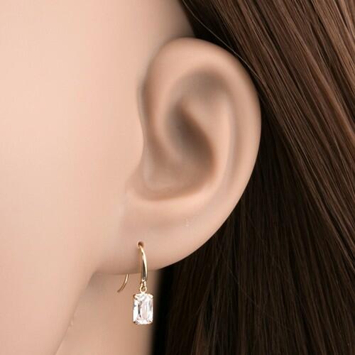 14K sárga arany fülbevaló csillogó szögletes cirkóniával, csiszolt felülettel és átlátszó színben, amely négyes foglalatban helyezkedik el. A fülbevaló afrikai horgon függ. Méretek: 4 x 6 mmFülbevaló mérete kapoccsal: 4 x 16 mm Súly: 0,7 gFémjelzéssel ellátott. Az ár egy párra vonatkozik.
