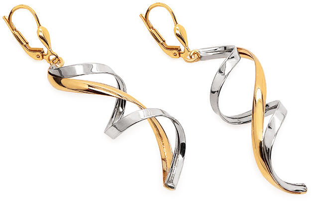 Az eleganciát sugárzó, sárga és fehér arany tökéletes tónusú fülbevalói egyedi spirál alakúak. A kéttónusú arany vonalai összefonódnak, így az eredeti kialakításuk kiemelkedik. A magasra polírozott arany felületkezelés gyönyörűen fényes megjelenést kölcsönöz a fülbevalóknak. A biztonságos rögzítést a klasszikus női patenton - Monacella használják.