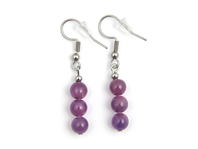 A rubin 6 mm-es drágakő gömbjeiből készített fülbevaló. Magassága kb. 4 cm. A felhasznált fém alapanyagok rozsdamentes acélból készültek.