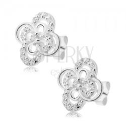 925 ezüst fülbevaló, amelyet egy csillogó virág alkot négy, nagyobb szirom kontúrral, amelyekben kis szirmok köronalai találhatók. A virág közepébe egy csillogó, kerek, átlátszó cirkónia van ültetve. Biztonságos viselését stekker biztosítja. A fülbevaló méretei: 13 x 12 mmA fülbevaló súlya: 1,8 gFémjelzéssel ellátott. Az ár egy párra vonatkozik. .