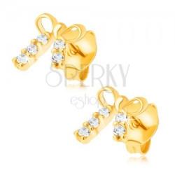 Fülbevaló 14K sárga aranyból apró masni alakban, melynek szalagjait beültetett kerek átlátszó cirkóniák díszítik. Biztonságos viselését stekker biztosítja. A fülbevaló mérete: 7 x 8 mmA fülbevaló súlya: 1,6 gAz ár egy párra vonatkozik. Fémjelzéssel ellátott.