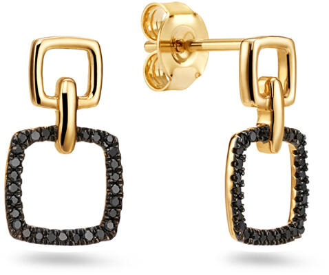 A geometrikus motívumú fülbevalók a minimalizmus és az extravagáns tökéletes kombinációja. 0,585 tisztaságú 14 karátos sárga aranyból készültek, modern dizájnnal rendelkező luxus ékszert képviselnek. Domináns jellemzőjük a 0,11 ct össztömegű fekete gyémántok, amelyek azonnal lenyűgöznek titokzatos eleganciájukkal és kontrasztot képeznek az arany meleg tónusával.