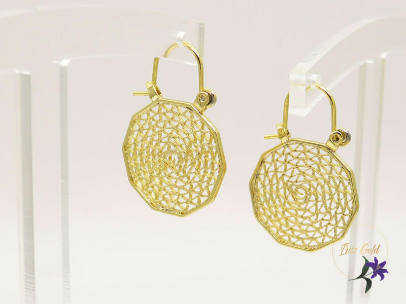 Gold Filled tallér formájú csipke mintázatú fülbevaló Szin: 14K Méret:18 mm átmérő , zárral 30 mm Zár: hagyományos A forgalmazott divatékszerek alapanyaga nikkel és ólommentes ezért többnyire nem okoznak allergiás tüneteket, nyugodtan hordhatják fémérzékeny emberek is. Általában nem színezik a bőrt és más divatékszerekhez képest nagyságrendekkel jobb kopásállós