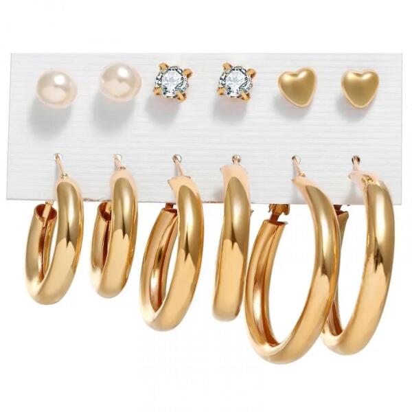 Hattie Fülbevalószett Hattie fülbevalószett szuper áron. A szett 6 pár különböző formájú, méretű és díszítésű fülbevalót tartalmaz. Nem tartalmaz nikkelt, ezért érzékeny bőrű emberek is viselhetik. Tulajdonságok: Anyaga: Fém ötvözet Szín: Arany A fülbevalók mérete: 0,6cm - 3cm