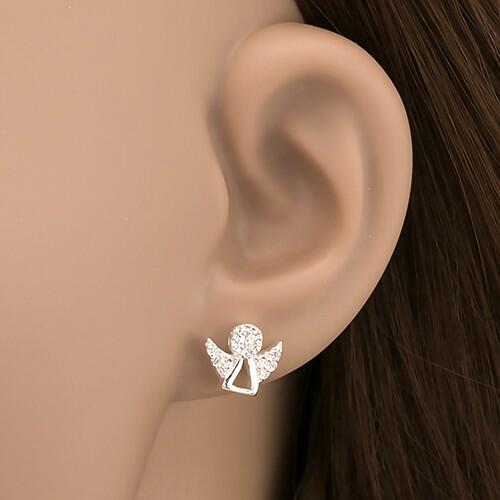 Bedugós fülbevaló 925-ös ezüstből, angyal sziluett alakban. A szárnyakat kis ragyogó cirkóniák díszítik. Az angyal feje helyén egy nagy kerek cirkónia található. Biztonságos viselését a stekker biztosítja. Méretei: 11 x 9 mmA fülbevaló súlya: 1,6 gAz ár egy párra vonatkozik. Fémjelzéssel ellátott.