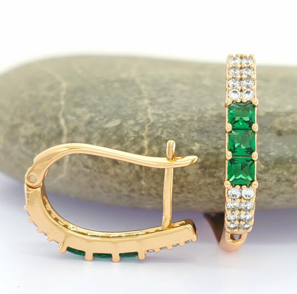 Aranyszínű fülbevaló, melyet smaragdzöld és fehér cirkónia kristályok tesznek csillogóvá. A kristályok karmos foglalatban helyezkednek el. Időtálló darab, nem kopik, nem feketedik, nem színezi a bőrt ( "gold filled"). Antiallergén ékszer, nem okoz panaszokat fémérzékeny hölgyeknek sem. 18K arany színben kapható. Fülbevaló hossza: 21 mm. Fülbevaló szélessége: 4 mm. Ka