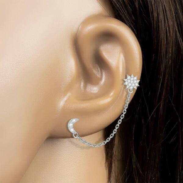 925 ezüst fülbevaló két füllyukhoz, amely egy rövid, ovális láncszemekből készült lánccal, ami a két fülbevalót köti össze, az éjszakai égbolt motívumaival. Az egyik fülbevaló feje csillagot formáz. Vékony tüskék közé ágyazott apró, átlátszó cirkóniák díszítik. A másik fülbevaló feje félhold alakú, és három kerek, átlátszó cirkónia díszíti. A fülb