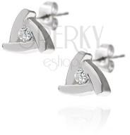Bedugós fülbevaló 925-ös ezüstből, háromszög alakban, három egyforma sávból, melyek csúsztatva vannak egymáshoz rakva. A középső részen egy kis ragyogó cirkónia díszeleg. Biztonságos viselését a stekker biztosítja. Méretei: 7 x 7 mmA fülbevaló súlya: 1,16 gAz ár egy párra vonatkozik. Fémjelzéssel ellátott.