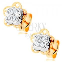 14K kombinált arany fülbevaló kis virág alakban. A virág szirmai legömbölyítettek és díszes vágatok találhatók rajtuk. A virág közepe fehér aranyból van, négy apró cirkóniával kirakva. Biztonságos viselését stekker teszi lehetővé. Méret: 6 x 6 mmSúly: 0,5 gFémjelzéssel ellátott. Az ár egy párra vonatkozik.