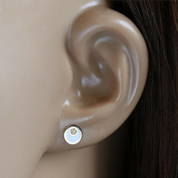 Az 585 sárga arany fülbevaló sima kör alakú, fehér színű, félhold alakú mintával. A körön belül egy kisebb kör található, melybe egy apró, átlátszó cirkónia van elhelyezve. A fülbevaló stekker zárral rendelkezik. A fülbevaló átmérője: 6 mm A fülbevaló súlya: 0,4 g Fémjel - Van. Az ár egy párra vonatkozik!