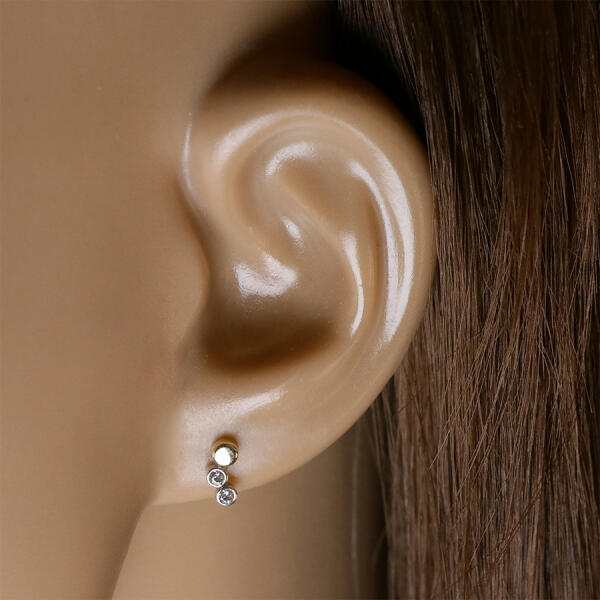 A 14K kombinált arany fülbevalót egy tükörfényes és sima kör alkotja, amelyhez két kerek, fehér arany színű foglalat van illesztve. A foglalatokba csiszolt átlátszó cirkóniák vannak ágyazva. Fülbevaló stekkeres zárszerkezettel. A fülbevaló mérete: 3 x 7 mmA fülbevaló súlya: 0,4 gFémjelzéssel ellátva. Az ár egy párra vonatkozik.