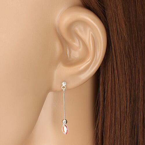 Fülbevaló ezüstből kis kerek átlátszó kristállyal, amely alatt vékony egyenes pálca található ezüst golyó befejezéssel. A pálca szem alakú szivárvány Swarovski kristállyal fejeződik be. A fülbevaló kapcsolása stekkeres. A fülbevaló méretei: 3 x 29 mmA fülbevaló súlya: 0,64 gFémjelzéssel ellátott. Az ár egy párra vonatkozik.