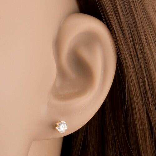 Az 585 sárga arany fülbevalót egy kerek, csiszolt, átlátszó cirkónia alkotja, egy hat-pálcás foglalatba helyezve. Biztonságos viselését stekker teszi lehetővé. Fülbevaló átmérője: 4 mmFülbevaló súlya: 0,67 gFémjelzéssel ellátott. Az ár egy párra vonatkozik.