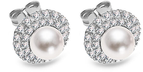 Egy pár csillogó, fehér aranyból készült fülbevaló, amely tele van szelíd eleganciával, a nő egyedi dísze. Kettős tiszta cirkon sor veszi körül Biwa fehér édesvízi gyöngyét. A fehérarany szépsége tökéletesen kiemelkedik egy fényes felületen.