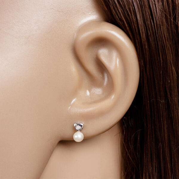 Briliáns csiszolású gyémánt fülbevaló 9K fehér aranyból, egy kis szívvel, amelybe egy átlátszó színű kerek gyémántot helyeztek. A szívhez egy édesvízi tenyésztett fehér gyöngy van erősítve. A fülbevaló stekker zárral rendelkezik. A fülbevaló méretei: 4 x 7,5 mm Gyöngy átmérő: 4 mmA gyémánt átmérője: 1,5 mm A gyémántok teljes karátszáma: 0,03 ct Tisztasá
