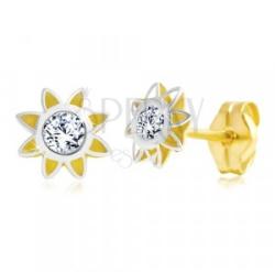 A 14K kombinált arany fülbevaló kerek virág alakú hegyes szirmokkal. Közepébe egy kerek átlátszó cirkónia van beültetve. A virág felső része fehér aranyból, az alsó része pedig sárga aranyból van. Biztonságos viselését stekker teszi lehetővé. Fülbevaló átmérője: 5 mmFülbevaló súlya: 0,4 gFémjelzéssel ellátott. Az ár egy párra vonatkozik.