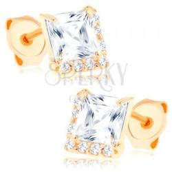 Bedugós fülbevaló 14K sárga aranyból egy nagyobb átlátszó cirkóniával négyzet alakra csiszolva. A négyzet egyik oldala és az alja kicsi, kerek kövekből álló sávval van keretezve. Biztonságos viselését stekker biztosítja. A fülbevaló méretei: 5 x 5 mmA fülbevaló súlya: 0,7 gFémjelzéssel ellátott. Az ár egy párra vonatkozik.