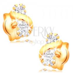 Arany karikás fülbevalók 14 karátos sárga aranyból. A fülbevalókat átlátszó cirkóniával díszítik, masszív négyszeres alakban.