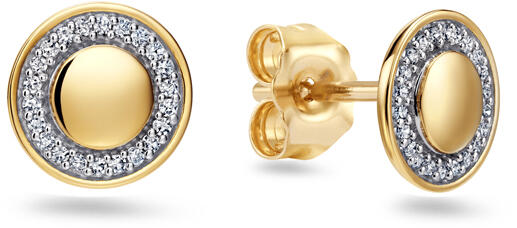 A kör motívumú sárga arany csokornyakkendő fülbevalók a finomság és az elegancia megtestesítői. A kiváló minőségű 14 karátos sárga aranyból (tisztaság 0,585) készült fülbevalók lenyűgözik visszafogott, mégis fényűző dizájnjukat. A karmát és a végtelent jelképező arany kört csillogó természetes gyémántok veszik körül. A 0,070 ct össztömegű gyémántok (