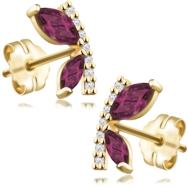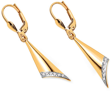 Elegáns fülbevalók egyedi kivitelben, ötletes díszítéssel, háromszög alakban, kerek profillal. Alsó része fényes cirkóniákkal van kirakva és részben ródiummal bevont, hogy a sárga és fehérarany színe még tökéletesebb legyen.