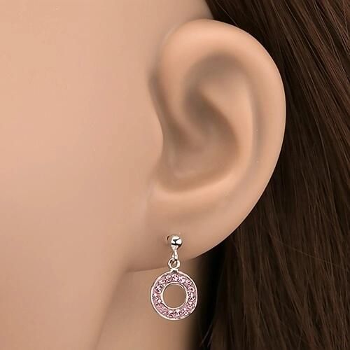 Bedugós fülbevaló sterling ezüstből. A fejecske egy fényes golyócska, melyhez karikák segítségével egy üreges körlap van fogatva. Felülete rózsaszín anyaggal van kitöltve, melybe rózsaszín cirkóniák vannak ágyazva. Biztonságos viselését a stekker biztosítja. A karika átmérője: 9 mmTeljes méret: 9 x 15 mmA fülbevaló súlya: 1,38 gAz ár egy párra vonatkozik. Fémjel