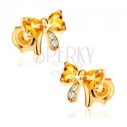 585 arany fülbevaló masni alakban sárga, élénk citrinekből, amely alatt két szalag függ. Az egyik átlátszó ciróniákkal díszített a másik pedig sima és fényes. Biztonságos viselését stekker biztosítja. A fülbevaló méretei: 6 x 6 mmA fülbevaló súlya: 0,6 gFémjelzéssel ellátott. Az ár egy párra vonatkozik.
