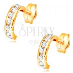 A sárga 14K arany fülbevaló kis félkör alakú, amelyet középen átlátszó cirkóniák függőleges vonala díszíti. A cirkóniás sávot vékony, fényes, arany szélek szegélyezik. Biztonságos viselését stekker teszi lehetővé. Fülbevaló méretei: 2,5 x 9 mmFülbevaló súlya: 0,7 gFémjelzéssel ellátott. Az ár egy párra vonatkozik.