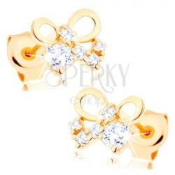 Fülbevaló 14K sárga aranyból vékony szalaggal masnira kötve. A masni közepébe és az alsó részébe élénk, átlátszó, kerek cirkóniák vanak ültetve. Biztonságos viselését stekker biztosítja. A fülbevaló méretei: 7 x 5 mmA fülbevaló súlya: 0,5 gFémjelzéssel ellátott. Az ár egy párra vonatkozik.