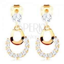 585 arany fülbevaló kis csillogó cirkónia alakban, mely alatt két ív függ, ami szerencsepatkóra emlékeztet. A kisebb ív fényes és sima felszínű, miközben az alsó részéhez nagyobb átlátszó cirkóniás ív kapcsolódik. A fülbevaló kapcsolása stekkeres. Fülbevaló mérete: 8 x 15 mmFülbevaló súlya: 0,7 gFémjelzéssel ellátott. Az ár egy párra vonatkozik.