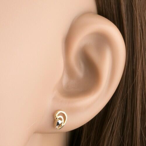 Fülbevaló 9K aranyból fordított könnycsepp kontúrral, amelyet félholdak alkotnak arany és ezüst színkombinációban. Két vékony félhold arany színű. Az ellentétesen elhelyezett kicsi félhold felülete ródiummal kezelt és ezüst árnyalata van. A fülbevaló hátsó oldala üreges. Biztonságos viselését stekker biztosítja. A fülbevaló méretei: 5 x 7 mmA fülbevaló súlya: