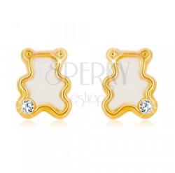 A 14K sárga arany fülbevaló kicsi medve alakú, amelynek közepét természetes fehér színű gyöngyház tölti ki, enyhén szivárványos visszfénnyel. A medve forma szegélye keskeny és enyhén kiemelt. Egyik lábában egy enyhén kiemelkedő foglalat helyezkedik el beültetett átlátszó cirkóniával. Biztonságos viselését stekker teszi lehetővé. Fülbevaló méretei: 4 x 5 mm Fü