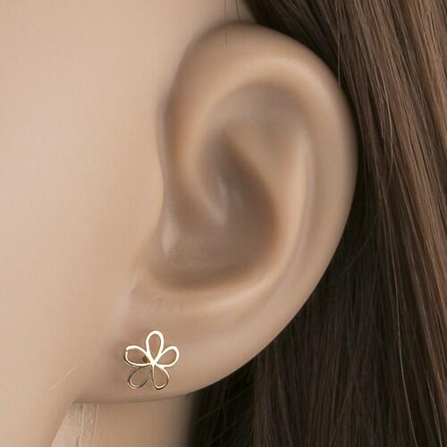 Fülbevaló 14K sárga aranyból fényes ötszirmú virág alakban, mely vékony lekerekített vonalú virágból áll. A fülbevaló kapcsolása stekkeres. Fülbevaló mérete: 8 x 8 mmFülbevaló súlya: 0,34 gFémjelzéssel ellátott. Az ár egy párra vonatkozik.