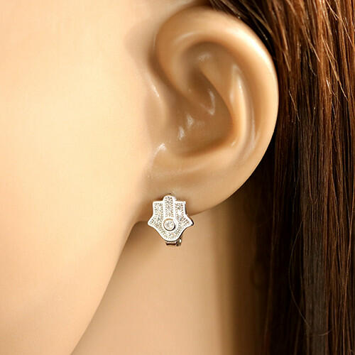 A 925 ezüst fülbevalók ródiummal bevont felülettel a "Fatima keze" mintát ábrázolják. A kéz apró csillogó, átlátszó cirkóniákkal van kirakva. Középen egy kerek cirkónia ül sima keretben. A fülbevaló orosz zárral rendelkezik. Méret: 10 x 12 mm Gyűrű súlya: 3,29 g Fémjel - Van. Az ár egy párra vonatkozik. A ródiummal bevont felület garantálja az ékszerek hosszabb
