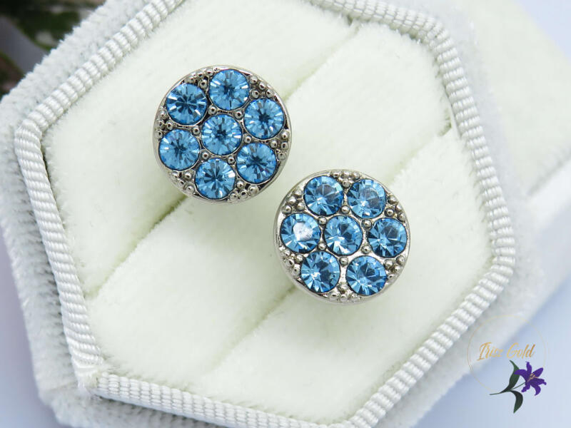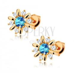 375 arany fülbevaló kivirított virág alakban, mely belsejében csiszolt kerek kék színű topáz található, fényes sima váltakozó átlátszó cirkóniás szirmokkal. Biztonságos viselését stekker biztosítja. A virág méretei:7 mm A fülbevaló súlya: 0,67 gFémjelzéssel ellátott. Az ár egy párra vonatkozik.