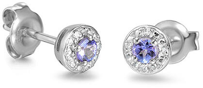 A tanzanit fülbevaló kör alakú, briliáns csiszolású gyémántokkal kirakott, középen egy kiváló minőségű, természetes tanzanittal díszített fülbevaló. A nyolc gyémánt összsúlya 0,020 ct, színe H, tisztasága SI1. A tanzanitok összsúlya 0,140 ct. A fülbevaló praktikus pillangócsattal van ellátva, hogy biztosan a fülön maradjon.