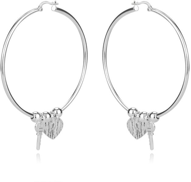 A 925 ezüst fülbevalók klasszikus karikák, kulcsos medállal és egy szívvel, amely finoman strukturált felületű. A medálok között sima, fényes felületű golyók vannak. A fülbevaló francia zárral záródik. Átmérő: 53 mmSzélesség: 2 mmA fülbevaló súlya: 13,30 gAz ár egy párra vonatkozik. Fémjel - Van.