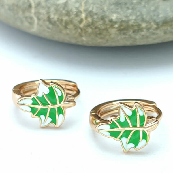 Aranyszínű, levél alakú motívummal és zöld-fehér tűzzománc jellegű festéssel díszített fülbevaló. Időtálló darab, nem feketedik, nem színezi a bőrt ( "gold filled"). Antiallergén ékszer, nem okoz panaszokat fémérzékeny hölgyeknek sem. 18K arany színben kapható. Fülbevaló belső átmérője: 10 mm. Levél minta szélessége: 10 mm. Az antiallergén ékszerek olyan fé
