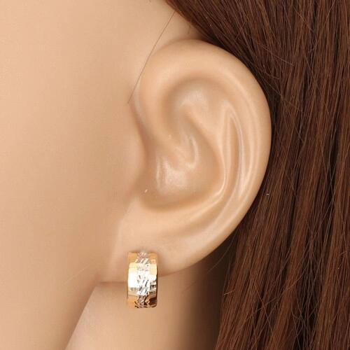 A kombinált 585 arany fülbevaló egy szélesebb, fényes felületű karikából áll, amelyet az elülső részben egy csillogó téglalap díszít. A díszes rész apró, csiszolt lapokból áll és fehér arany réteggel borított. A karika hátoldala fényes és sima. A fülbevaló szögecskés kapcsolással rendelkezik. Karika szélessége: 6 mmBelső átmérő: 9 mmKülső átmérő: 13 mmF