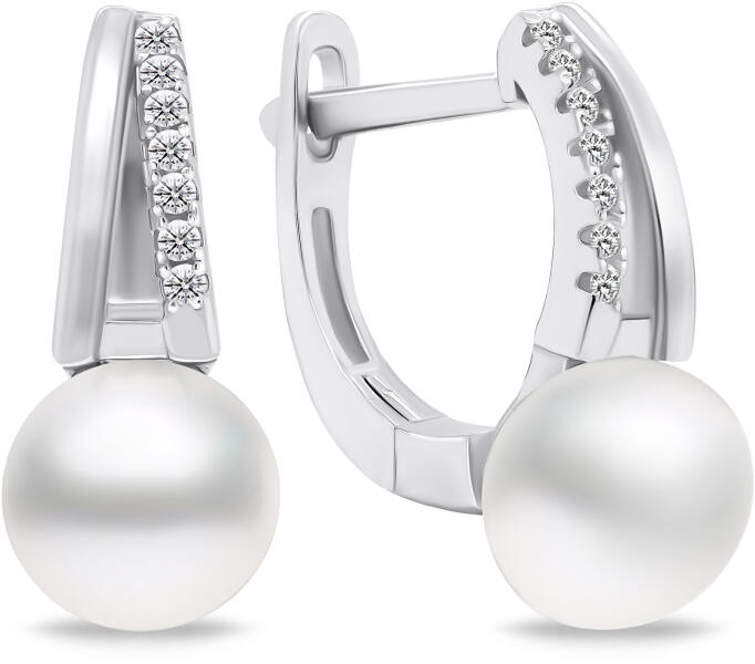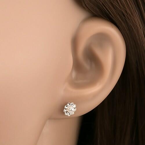 925 ezüst fülbevaló beszúrós kapcsolással és díszített résszel. Ezt fehér gyöngy alkotja átlátszó Preciosa kristályokkal körülvéve, melyek a virág szirmait alkotják. A fülbevaló átmérője: 6 mmA fülbevaló súlya: 0,40 gFémjelzéssel ellátott. Az ár egy párra vonatkozik.