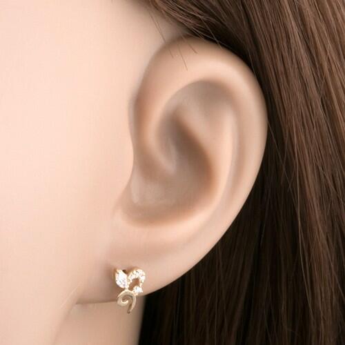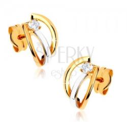Ródiummal ellátott fülbevaló 9K aranyból három szabálytalan ívvel, miközben a két szélső sárga aranyból készült és a középső fehér arany. A fülbevaló felső részén egy csillogó kerek átlátszó cirkónia van elhelyezve. Beszúrós kapcsolás. A fülbevaló méretei: 6 x 9 mm A fülbevaló súlya: 0,5 g Fémjelzéssel ellátott. Az ár egy párra vonatkozik. A ródiummal