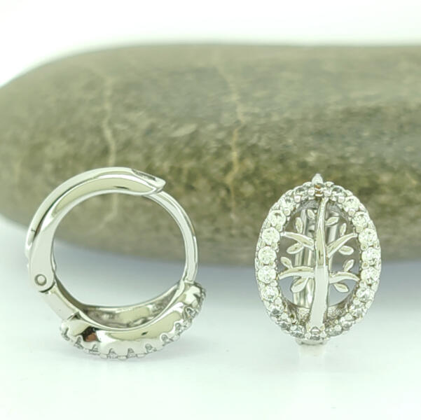 Ezüstszínű karika fülbevaló, melyet fehér cirkónia kristályok tesznek csillogóvá és életfa motívum díszít. A kristályok karmos foglalatban helyezkednek el. Időtálló darab, nem kopik, nem feketedik, nem színezi a bőrt. Antiallergén ékszer, nem okoz panaszokat fémérzékeny hölgyeknek sem. Fülbevaló szélessége: 8,5 mm. Karika belső átmérője: 10 mm. Az antiallergén