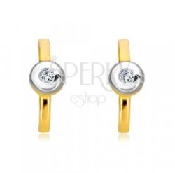 585 kombinált arany fülbevaló, keskeny ívelt alakú. Az alsó részén íveltebb. Közepében egy apró kerek átlátszó cirkónia van elhelyezve. A cirkóniát fehér arany öv veszi körül. A fülbevaló biztonságos viselését stekkeres zárszerkezet teszi lehetővé. Fülbevaló méretei: 3 x 9 mmFülbevaló súlya: 0,4 gFémjelzéssel ellátott. Az ár egy párra vonatkozik.