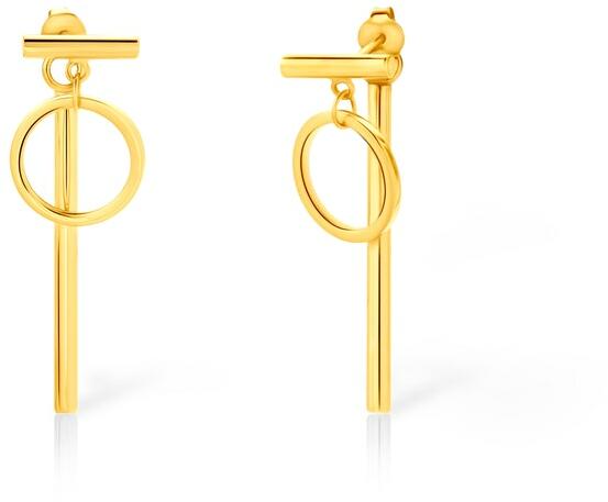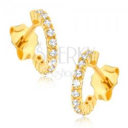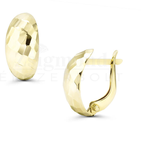 Arany fülbevaló befejezetlen kör alakban. Az előlap beágyazott tiszta cirkóniákkal van díszítve, melyeket kis pötyök vesznek körül mind a négy oldalról. Az oldalakon finom gravírozott vonalakkal vannak, melyek az elhelyezett ragyogó kövek helyét mutatják. Biztonságos viselését a stekkerek biztosítják. Átmérő: 10 mmSzélesség: 1 mmA fülbevaló súlya: 1,1 gFémjelzéss